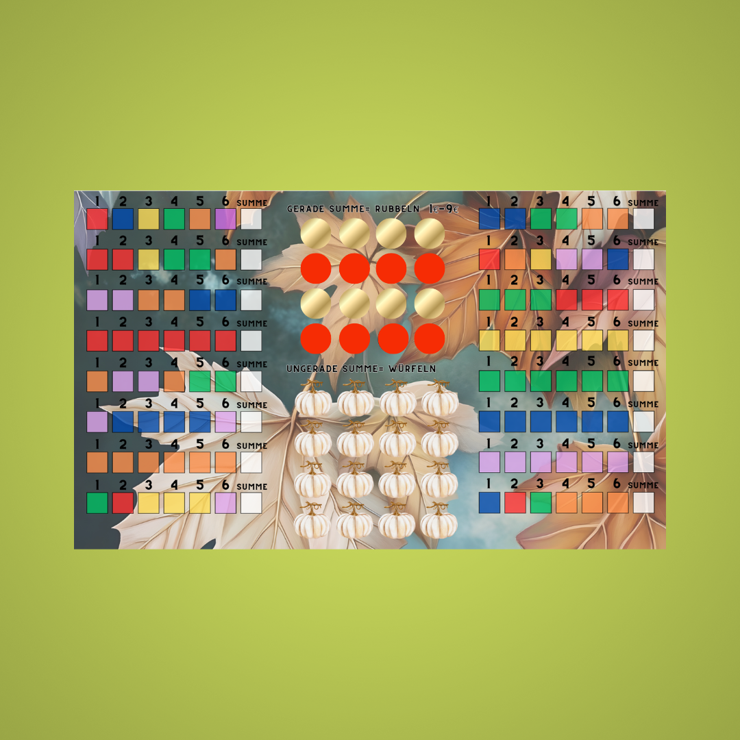 Bei dieser Würfelchallenge benötigt ihr einen 6seitigen Würfel und Farbwürfel. Du würfelst mit beiden Würfeln und versuchst mit so wenigen Versuchen wie möglich die Zahl und die dazugehörige Farbe zu erwürfeln. Notiere die jeweilige Anzahl der Versuche unter der jeweiligen Zahl. Du beginnst mit der 1 und dann der Reihe nach bis zur 6. Rechne deine Versuche zusammen. Bei einer geraden Summe darfst du ein Feld freirubbeln, bei einer ungeraden Summe würfelst du mit einem Würfel deiner Wahl und sparst den jeweiligen Betrag.