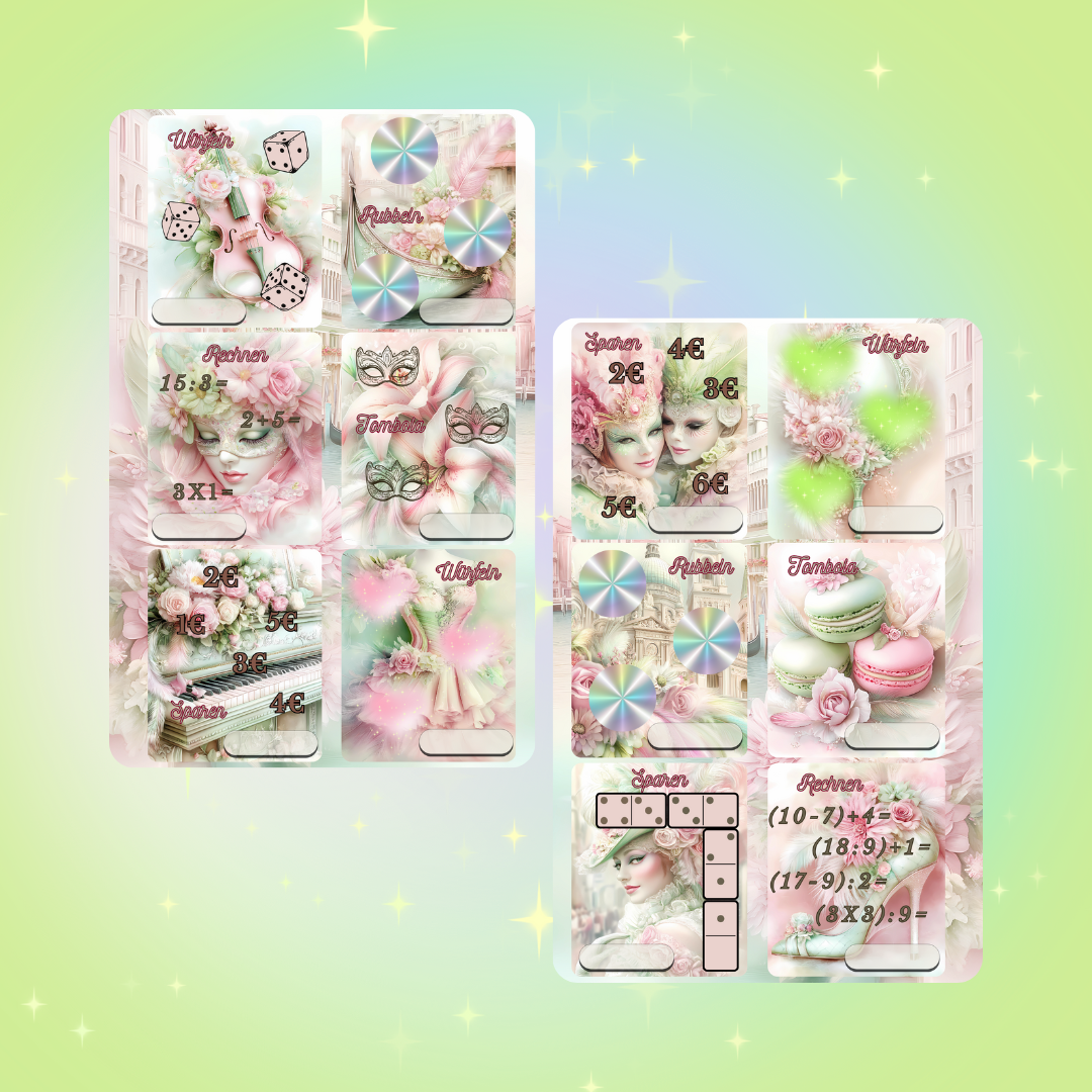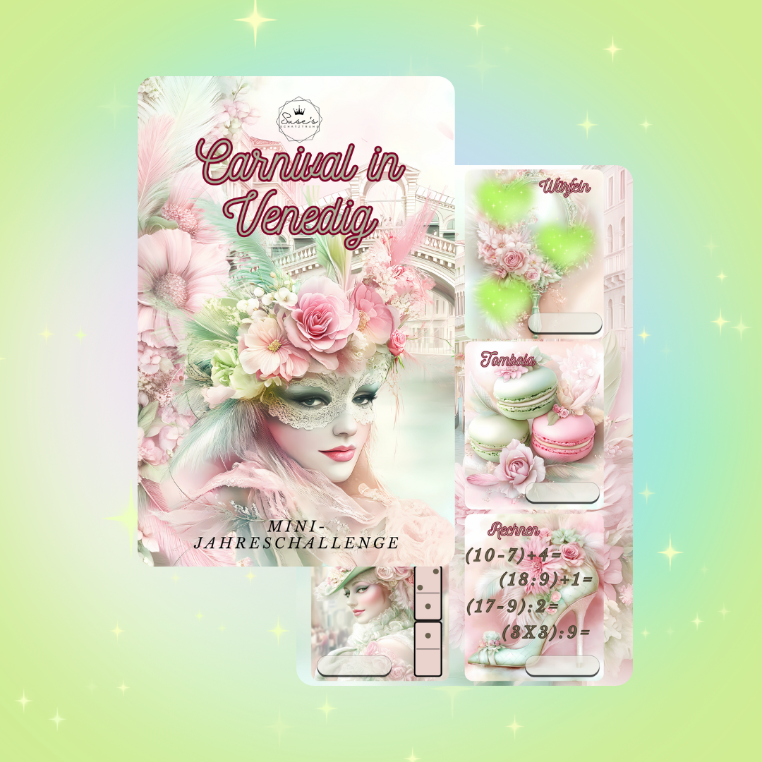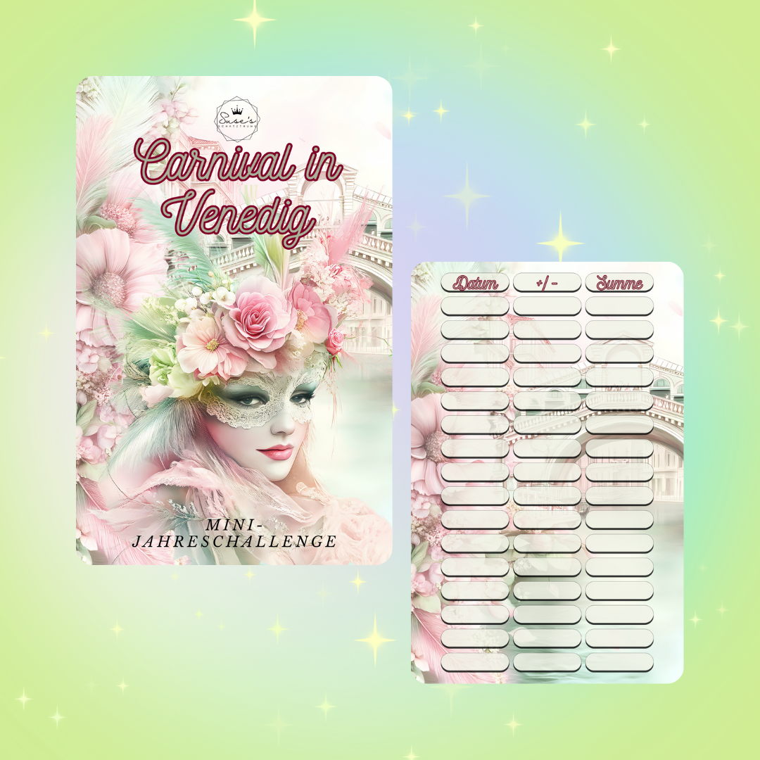Carnival in Venedig Mini Jahreschallenge ist in Pastelltönen gehalten und dreht sich rund um den Carnival in Venedig. Hier könnt Ihr euch die Monate selbst aussuchen und dann das ganze Jahr besparen. Die Beträge in dieser Challenge sind niedrig gehalten und Liegen zwischen 1 und 6 Euro. Lose und Würfelbeträge kann ich nicht beeinflussen, aber da habt ihr die Möglichkeit auch die Quersummen zu besparen.