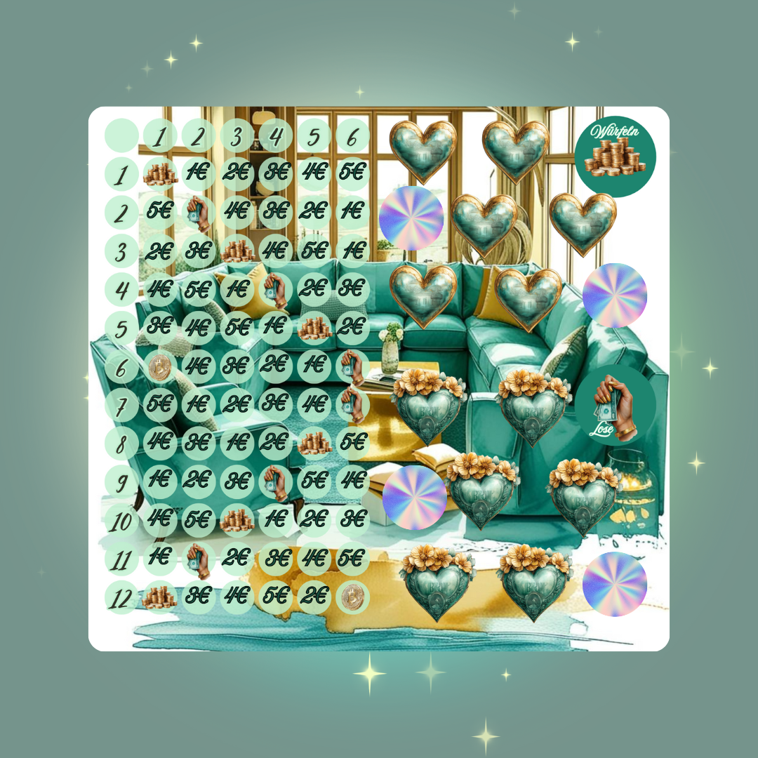 Green Couple ist eine 4seitige Klappkarte wo im Inhalt ein Bingo zu finden ist. In diesem Bingo sind Beträge von 1-5 Euro und vereinzelte Aktionsfelder wo ihr entweder Würfelt oder ein Los ziehen dürft. Es gibt aber nur 2 Münzen in diesem Bingo wo ihr selbst entscheidet welches Rubbelfeld ihr von den vier Rubbelfeldern freirubbelt. Ihr könnt aber pro Münze je zwei Felder rubbeln und die Quersumme beider Felder Sparen.