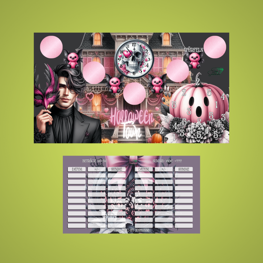 Halloween Town ist eine Challenge zum Rubbeln und kleinen Sparbeträgen zum Abstreichen oder Auffüllen. Die vorgegebenen Beträge liegen zwischen 1€ und 5€.