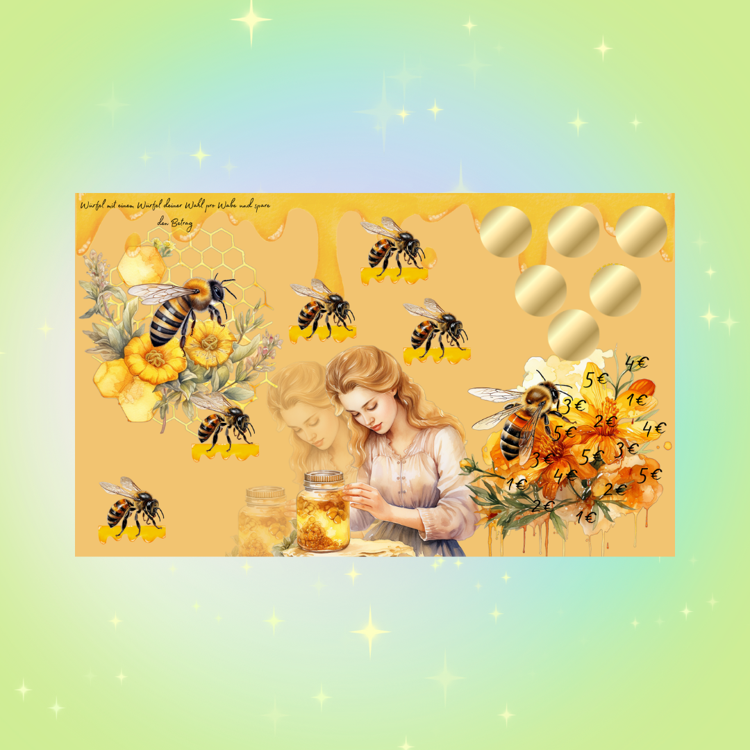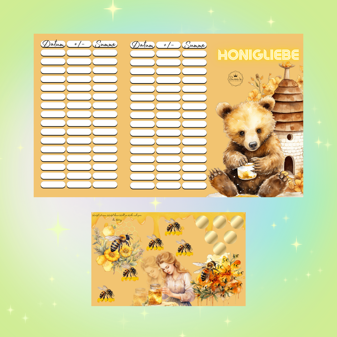 Honigliebe ist eine 6seitige Klappkarte. Sie beinhaltet verschiedene Aktionen. Die vorgegebenen Beträge sind nicht höher als 5 Euro.