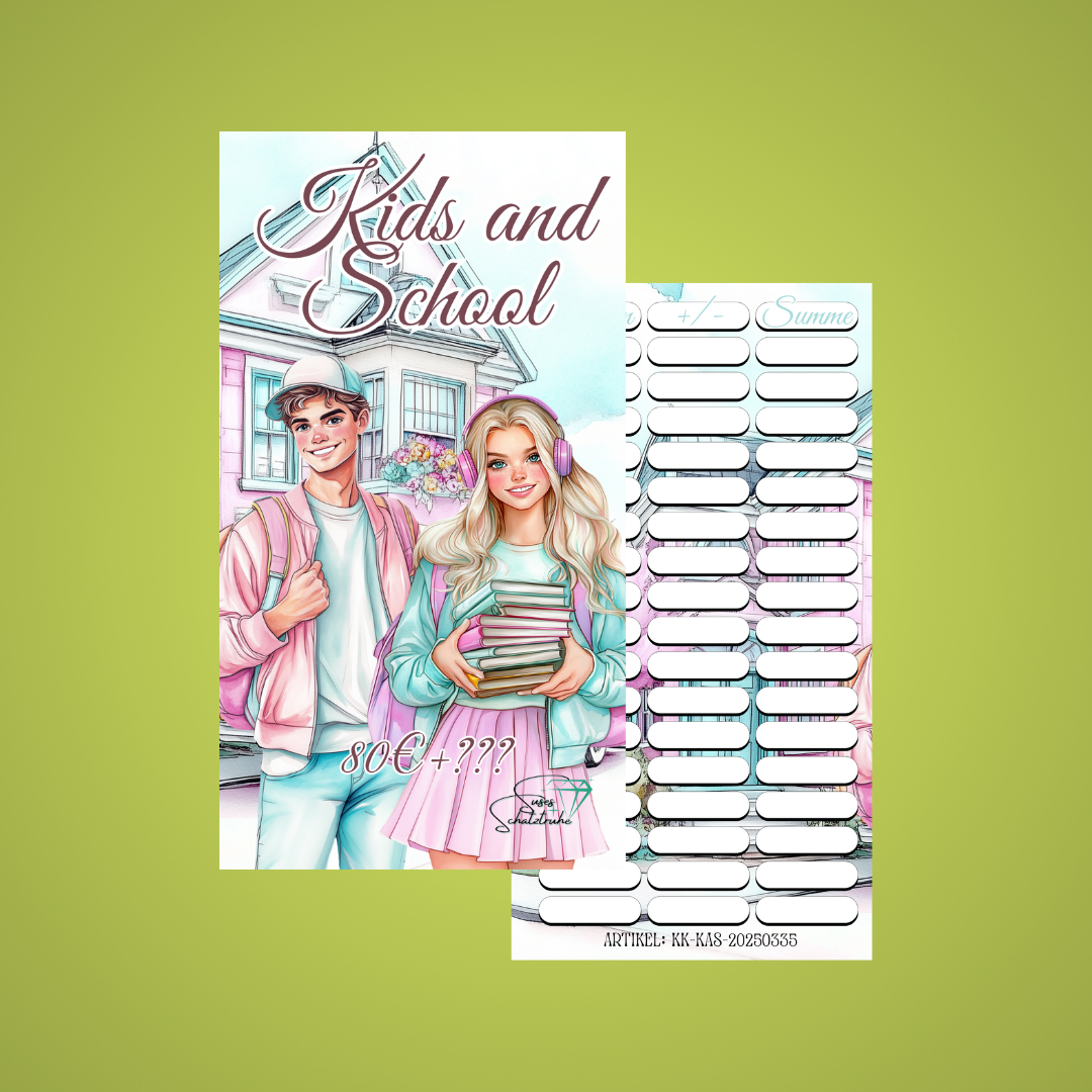 Kids and School ist eine 4seitige Klappkarte mit verschiedenen Sparaktionen. Unter den Feldern befinden sich Beträge zwischen 1€-8€!