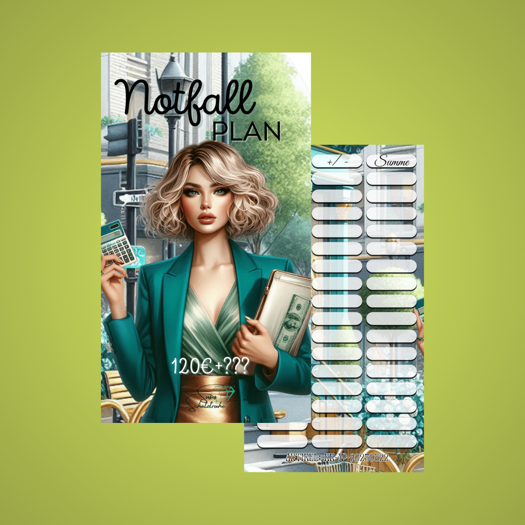 Notfallplan ist eine 6seitige Klappkarte mit verschiedenen Sparaktionen. Unter den Feldern befinden sich Beträge zwischen 1€-8€!