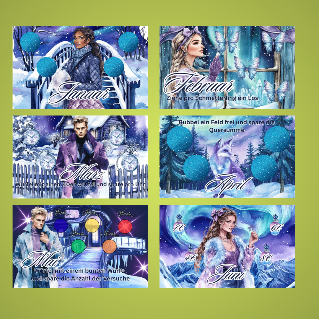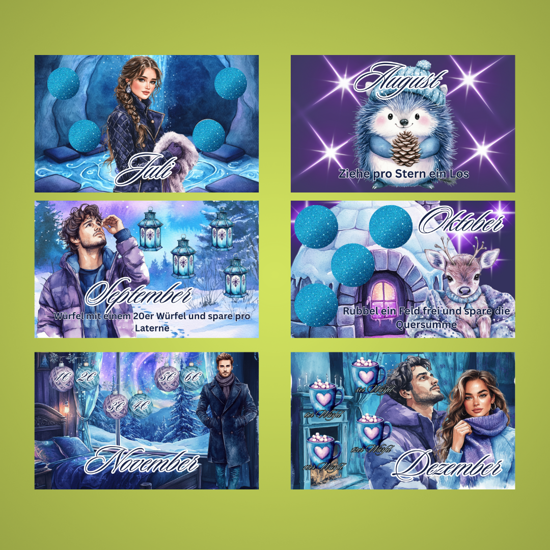Hier bekommt Ihr eine Jahreschallenge bestehend aus einem Deckblatt und 12 kleinen Challenges zum einheften wo ihr verschiedene Aktionen zum besparen findet. Die Beträge liegen zwischen 2€ und 8€.