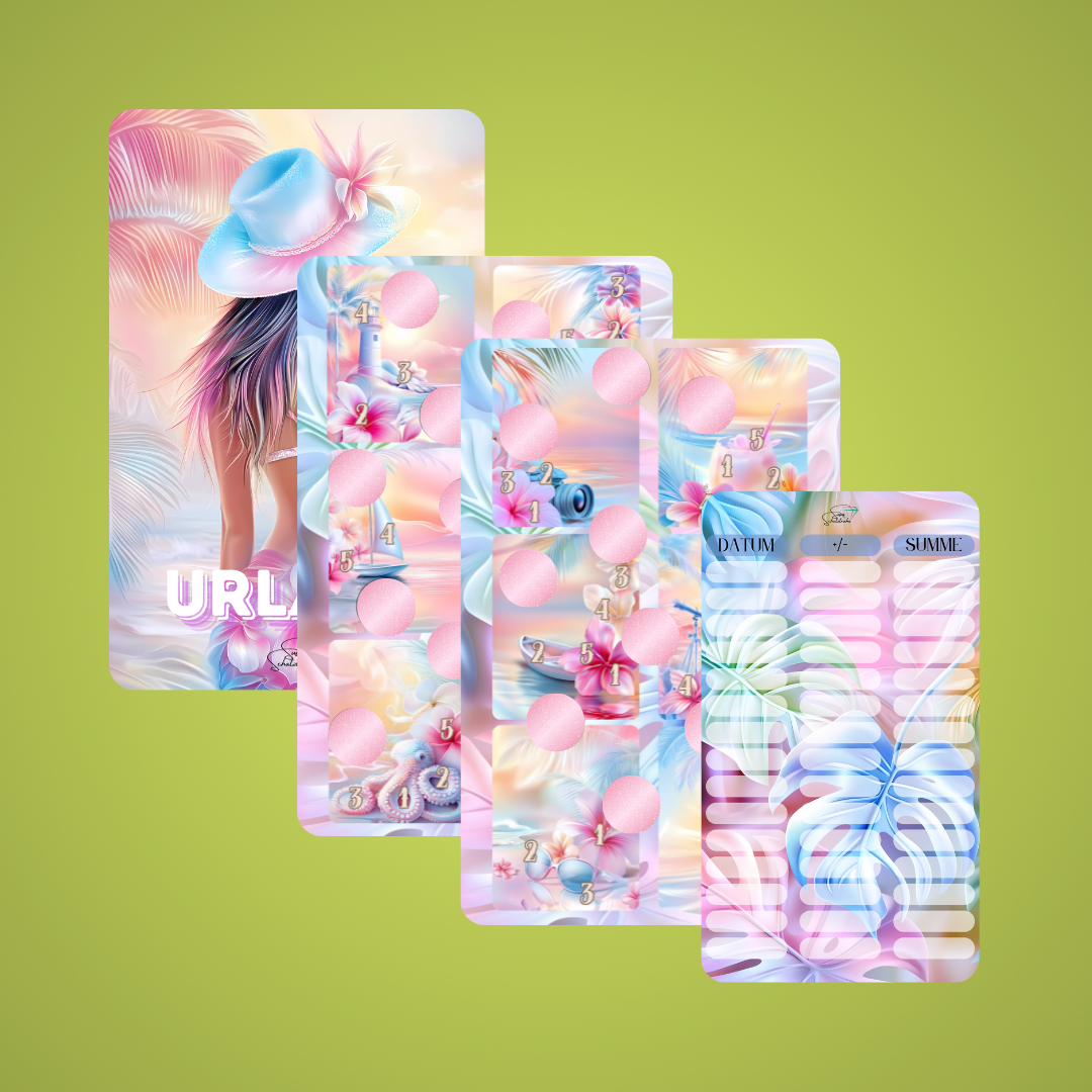 Hier bekommt Ihr eine Urlaubschallenge bestehend aus einem Deckblatt (was später weiterverwendet werden kann) und einer Challenge zum einheften wo ihr was zum Rubbeln und abstreichen findet. Die Beträge liegen zwischen 2€ und 6€.