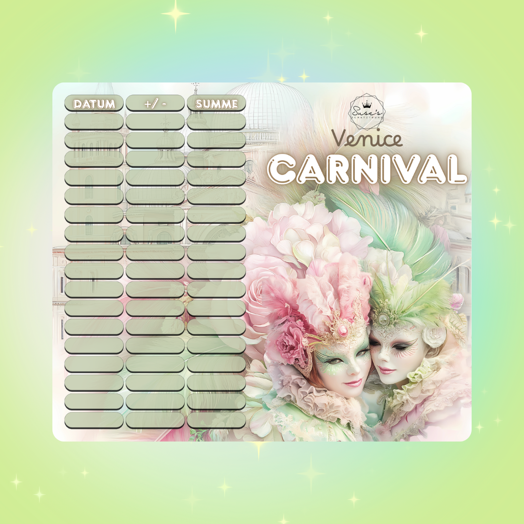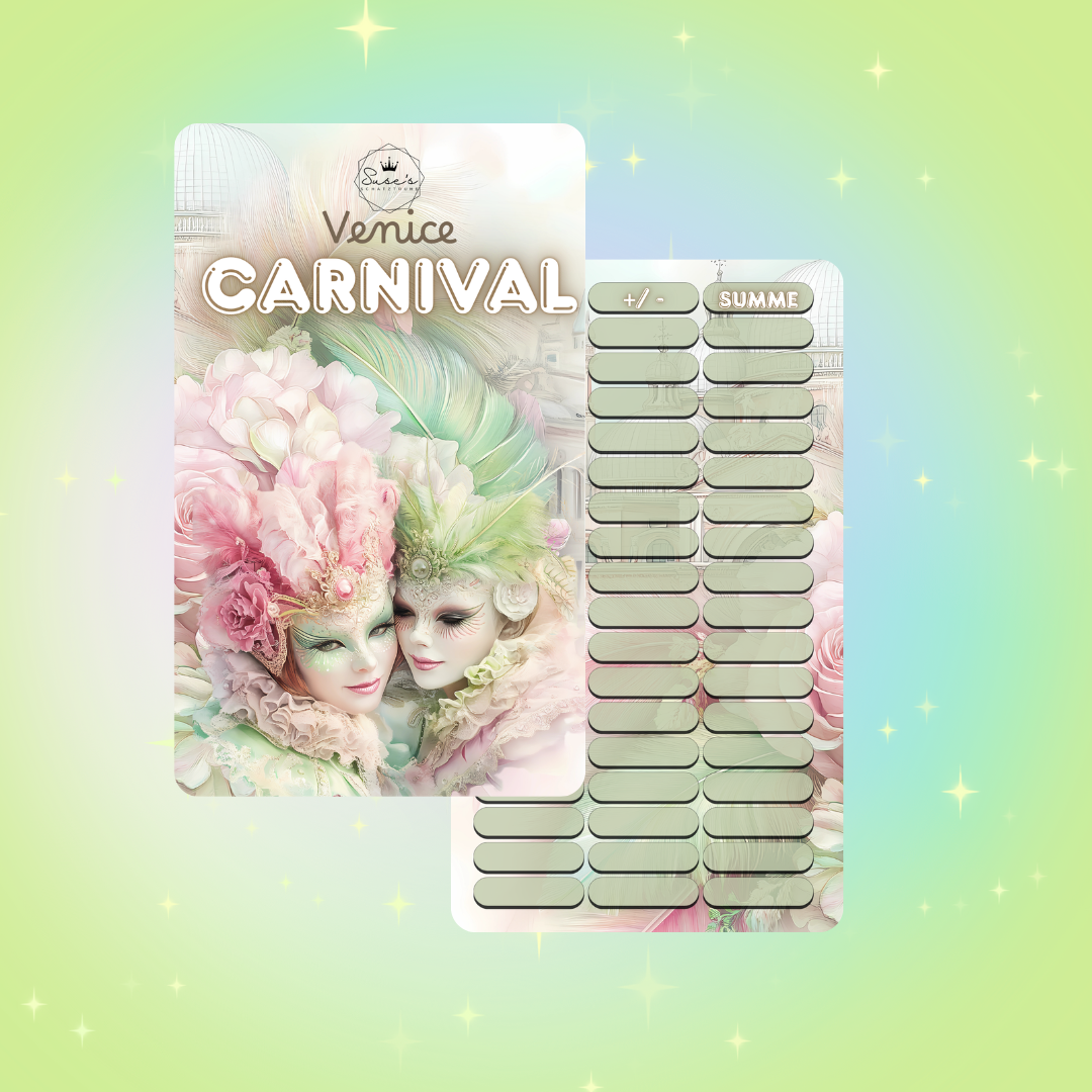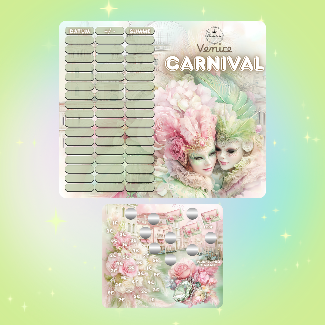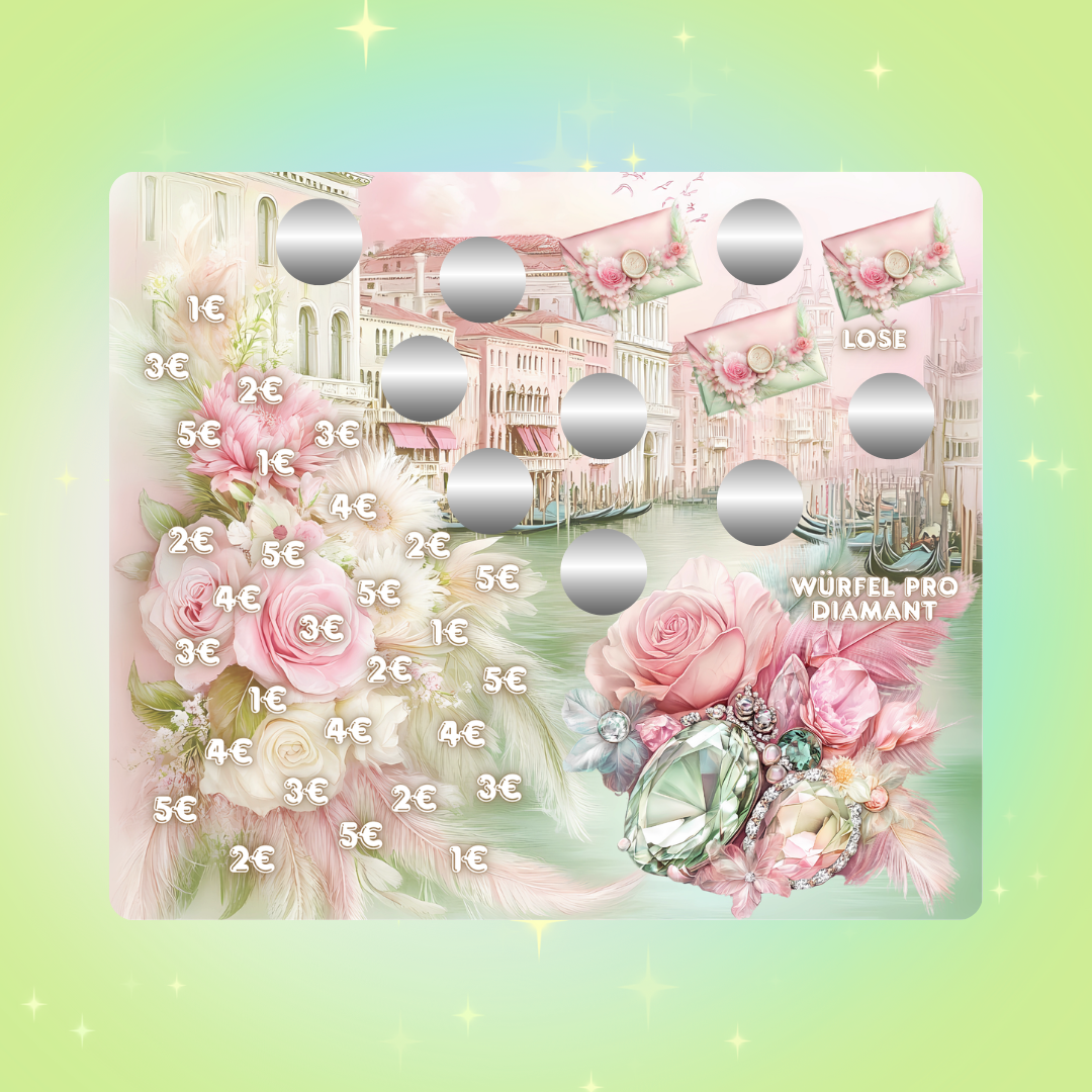 Venice Carnival ist eine A7 Klappkarte mit verschiedenen Aktionen: Würfeln, Tombola, Abstreichbeträge und Rubbelfelder.
