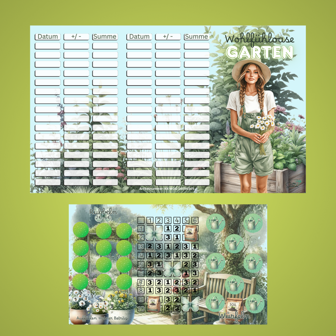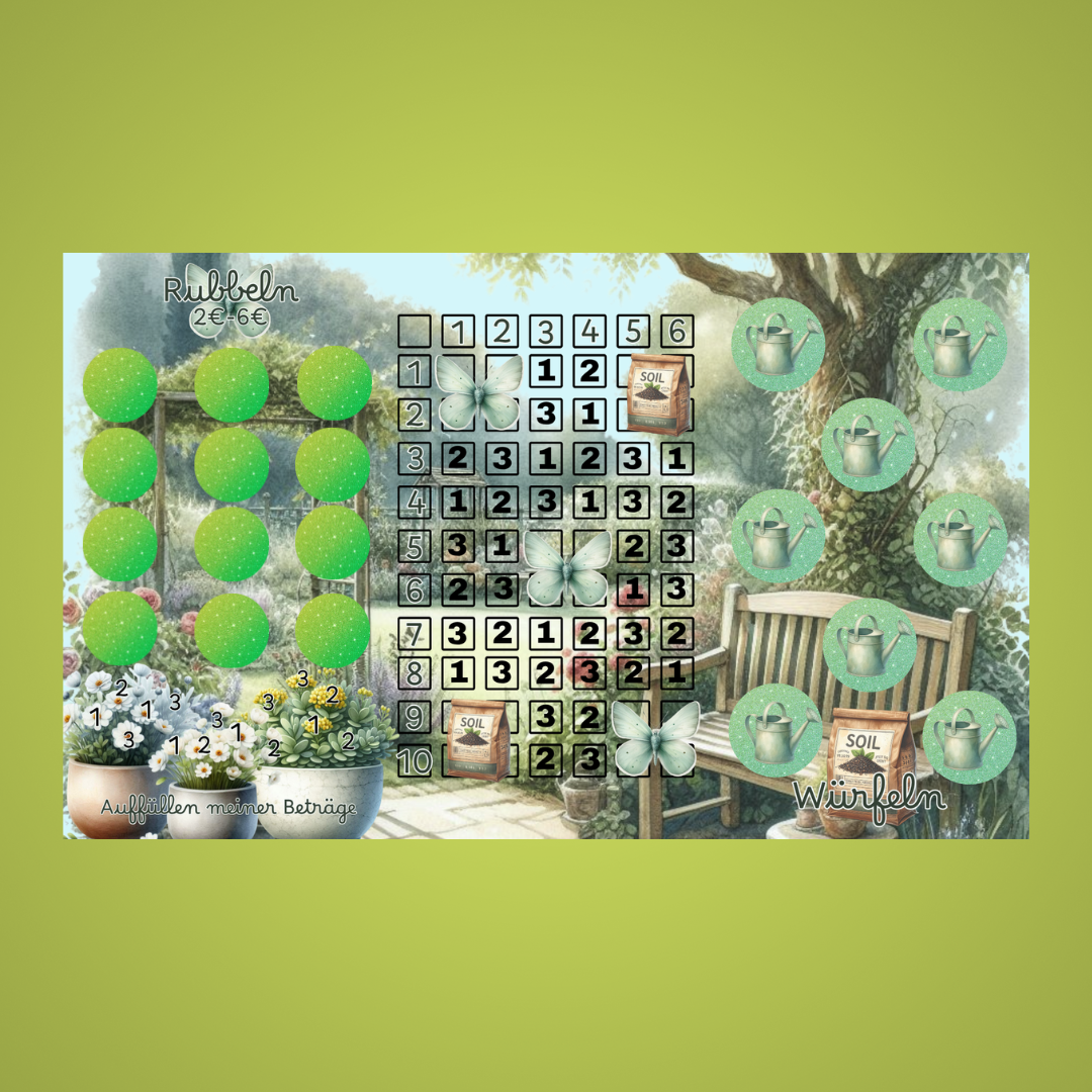 Die Wohlfühloase Garten ist eine Klappkarte zum Thema Garten. Sie beinhaltet ein Bingo mit verschiedenen Aktionen. Die vorgegebenen Beträge sind von 1€- 6€.